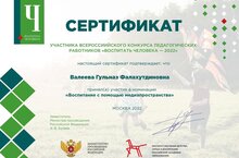 Валеева Г.Ф. - педагог-организатор МБОУ "Рыбно-Слободская гимназия №1" награждена сертификатом участника Всероссийского конкурса педагогических работников "Воспитать человека - 2022" в номинации "Воспитание с помощью медиапространства" Министерства просвещения Российской Федерации, Института изучения детства, семьи и воспитания Российской академии образования, Москва 2022.