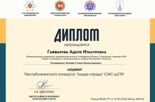 с 1 декабря 2021 по 1 марта 2022 года проводился Республиканский конкурс "Лидер отряда "СМС - дети". Конкурсное задание включала в себя создание видеоролика на тему: "Лидер отряда "СМС - дети", в котором необходимо отразить лидерские качества, успешный опыт работы и проведенные мероприятия лидера отряда "СМС - дети". В конкурсе приняла участие обучающаяся детского объединения "SаMоSтоятельные дети" - "Я-САМ" Гаффарова Аделя, руководитель Валеева Г.Ф. По итогам конкурса стала лауреатом и награждена Дипломом.