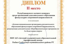 с 06 сентября по 05 октября 2022 года проводился Республиканский заочный конкурс среди организации дополнительного образования физкультурно-спортивной направленности по итогам работы за 2021/2022 учебный год. МБУ ДО "ДОО(П)Ц" принимал участие по номинациям №2 -"Лучшая муниципальная организация дополнительного образования физкультурно-спортивной направленности, реализующая дополнительные общеобразовательные программы по 3 и более видам спорта" и занял 2 место.