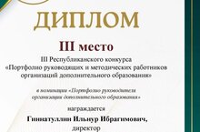 ГБУ ДО «Республиканский центр внешкольной работы» с педагогическими и руководящими работниками дополнительного образования на 2024-2025 учебный год для работников образовательных организаций с 03 февраля по 14 марта 2025 года, совместно с МБУ ДО «Центр эстетического воспитания детей» Елабужского муниципального района Республики Татарстан, был проведен III Республиканский конкурс «Портфолио руководящих и методических работников организаций дополнительного образования». Гиннатуллин Ильнур Ибрагимович директор МБУ ДО «ДОО(П)Ц» Рыбно-Слободского муниципального района приняв участие занял 3 место.