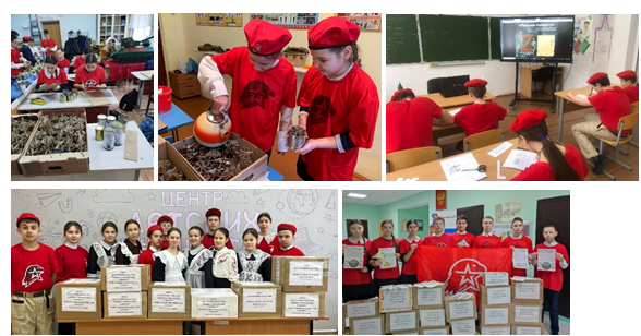 В преддверии Нового года прошла акция «Письмо солдату». Наши ребята, написали много писем с поздравлениями и словами поддержки для российских военнослужащих, участвующих в специальной военной операции. Окопные свечи-это своеобразные горелки, изготовленные из парафина, картона и жестяных банок. Их удобно использовать в полевых условиях для приготовления пищи или обогрева. Гореть такая свеча может от 3 до 5 часов. Юнармейцы подготовили партию окопных свеч для военнослужащих Вооружённых Сил Российской Федерации. Также школы принимают самое активное участие в сборе и подготовке к отправке очередной партии гуманитарной помощи военнослужащим.