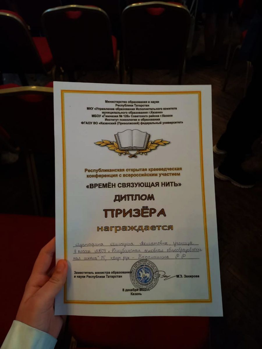 8 декабрьдә " "Краеведение" балалар берләшмәсе укучылары Мостафина Миләүшә Бөтенроссия катнашында республика ачык кваеведение конференциясендә катнашты, призер Дипломын алды. Җитәкчесе-Өстәмә белем бирү педагогы Бадамшина Фәйруза.Уңышлы чыгыш белән котлыйбыз!