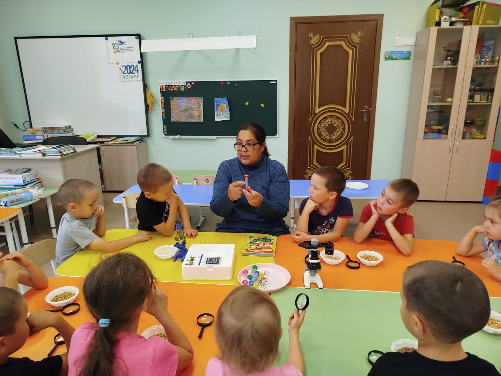 Опубликовано: 02.11.2024В связи с Годом научно-технологического развития в Республике Татарстан и Десятилетием науки и технологий в России в нашем саду прошли «Часы науки», где детей познакомили с микроскопом, песочными часами, лупой, пипеткой: где и в каких случаях они используются. Знакомство со свойствами воды в ходе разных экспериментов.