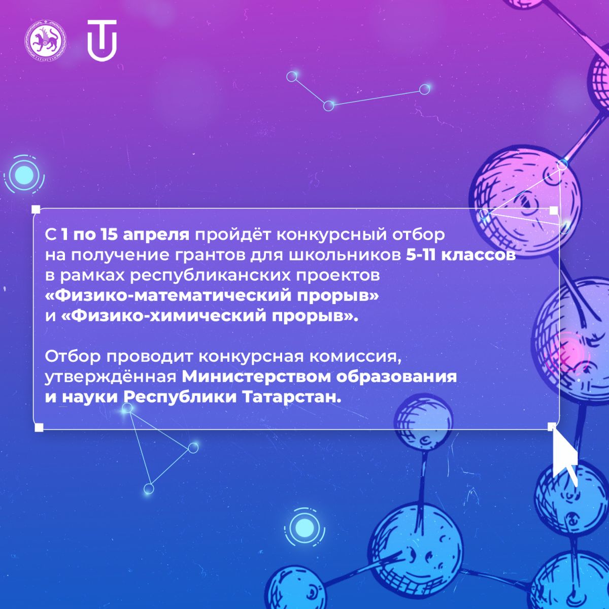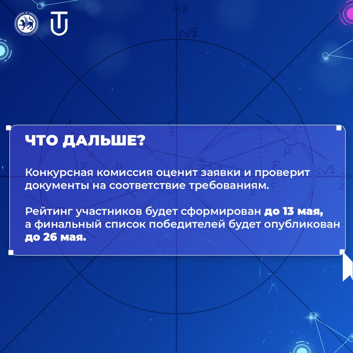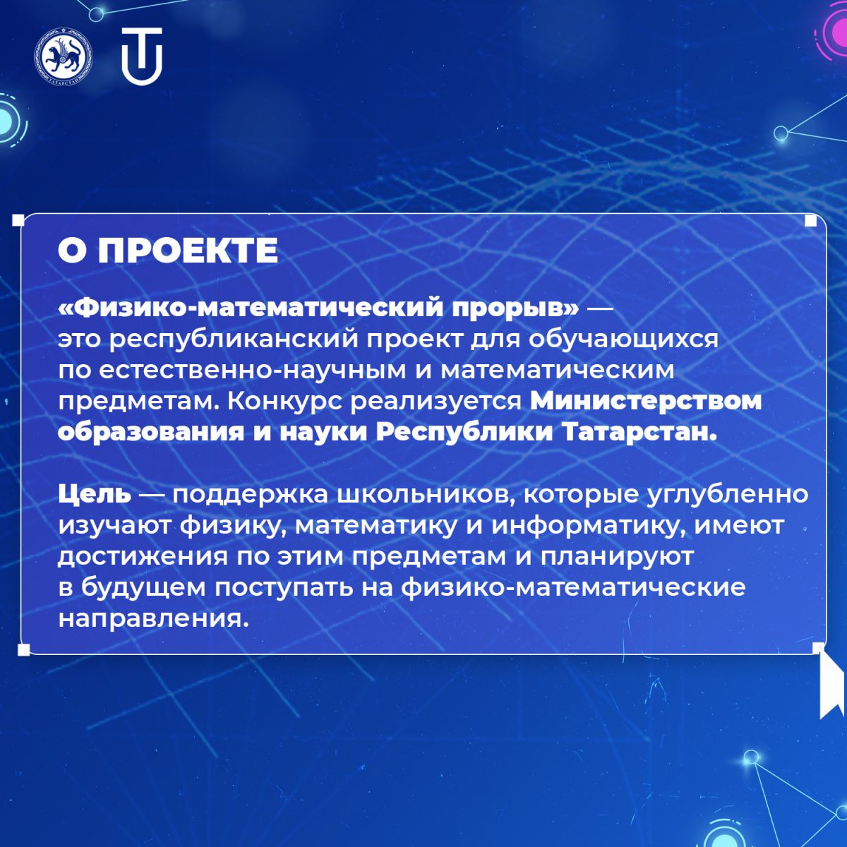 Совсем скоро стартует конкурсный отбор на соискание денежного вознаграждения обучающимися 5-11 классов общеобразовательных организаций Республики Татарстан, в рамках реализации проекта «Физико-математический прорыв».