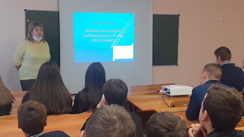 18.11.21, педагог-психолог Миронова Ю.А. социаль педагог Мингалеева Г. А. белән берлектә 6, 7, 8, 9 сыйныф укучылары өчен «Мәктәп эчендәге учетка куелу»темасына профилактик сыйныф сәгатьләре үткәрделәр. Укучыларга исәпкә куюның сәбәпләре һәм нәтиҗәләре аңлатылды.