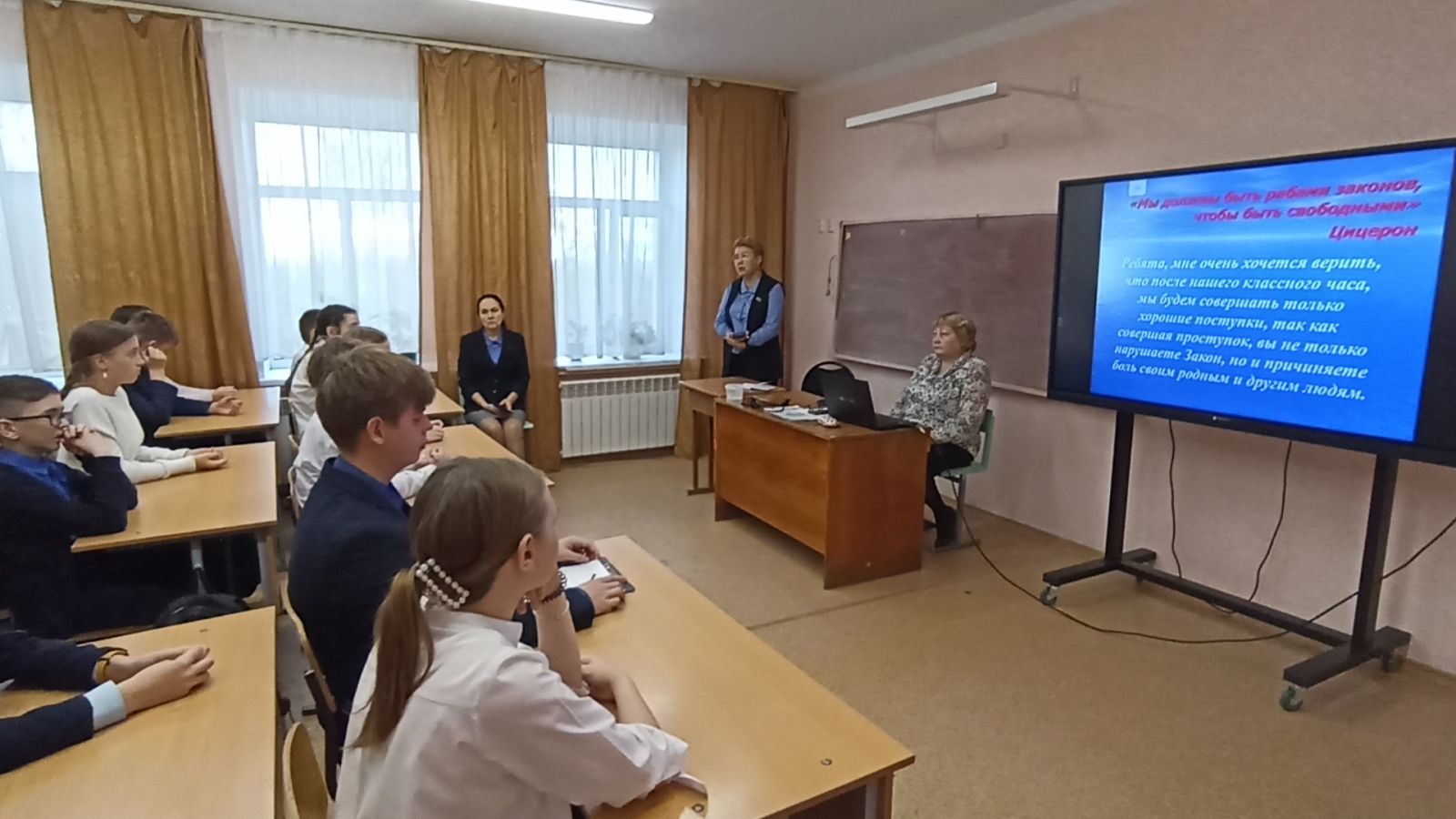 21 октябрьдә 7б, 11а сыйныф укучылары белән «Без үз гамәлләребез өчен җаваплы» дигән темага класс сәгате узды. Дәрестә шәһәр җирлеге депутаты Талалаева Мөнирә Роберт кызы катнашты. Чара яшүсмерләр хокук бозуларын профилактикалау һәм булдырмау, теге яки бу гамәлләр өчен яшүсмернең җаваплылыгы турында белемнәрне исәпкә алып, үз-үзеңне тоту моделен аңлы сайлау максатыннан үткәрелде.