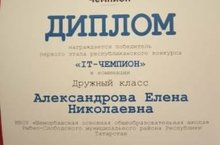 Учитель начальных классов Александрова Е. награждена дипломом победителя 1 этапа конкурса "IT-чемпион" в номинации "Дружный класс". Поздравляем!