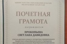 Учитель русского языка и литературы Прокопьева С.Д.была награждена Почетной грамотой МОиН РТ за весомый вклад в систему образования и воспитания подрастающего поколения и многолетний добросовестный труд. Поздравляем!