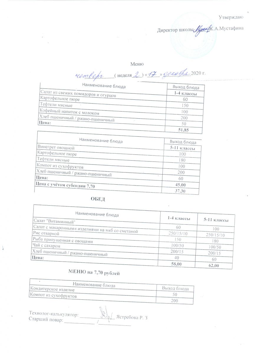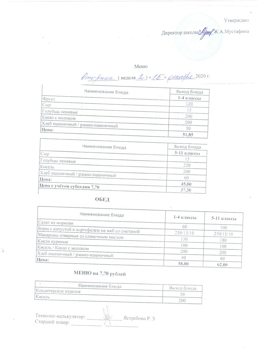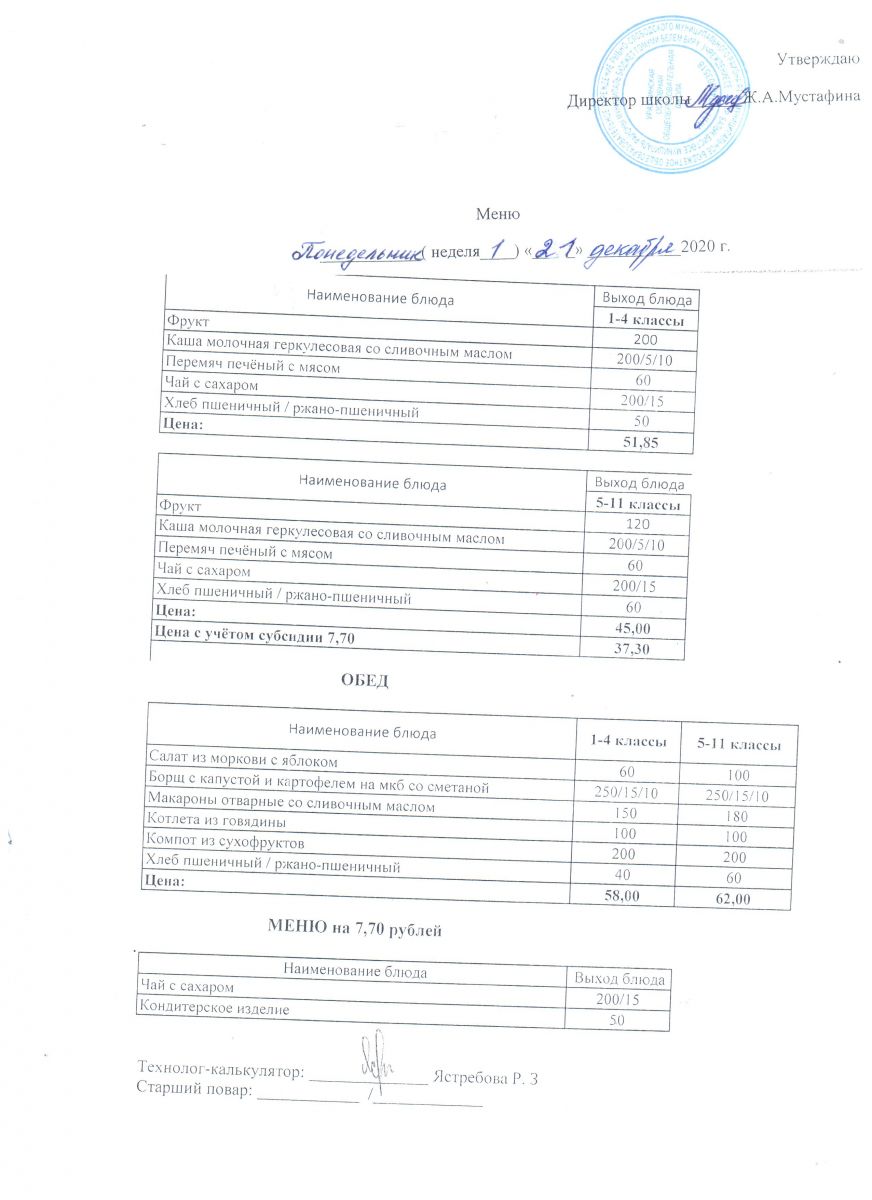 Примерное двенадцатидневное меню на 2020-2021 учебный год