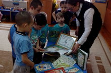 Балаларны китапханәче Миләүшә апалары Г,Тукайның китаплары белән таныштыра. 25.04.2018