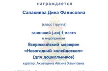 Воспитанница детского сада Салахиева Дина заняла 1 место в Всероссийском марафоне "Новогодний калейдоскоп".