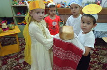 Сөмбелә икмәк бүләк итә.