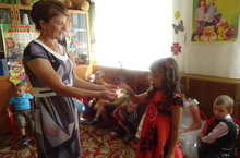 Тәрбияче Гөлзилә Хәтиповна Язгөлгә белем ачкычын бүләк итә.