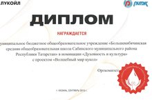 Наша школа стала победителем конкурса социальных и культурных проектов ПАО "Лукойл" в номинации "Духовность и культура". Автор проекта "Волшебный мир кукол" -заместитель директора по ВР Измайлова Г.М.