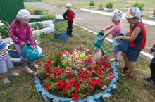 Гөлбакчабыз сүрелмәсен, шиңмәсен дип, аларга су сибәбез һәм апаларга да ярдәм итәбез.