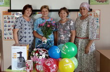Елена Васильевнаны юбилее белән тәбрик итәргә Завод Нырты урта мәктәбе профсоюз оешмасы җитәкчесе Сиринә Рафаэловна һәм озак еллар дәвамында бер коллективта, иңне иңгә куеп эшләгән хезмәттәше Гөлназ Илшатовна да килделәр.