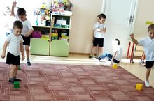 Физик культура эшчәнлегендә балалар белән бер аякта сикерергә өйрәндек һәм сәламәтлекне ныгыту өстендә эш алып бардык.