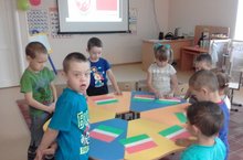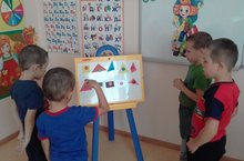 Математика эшчәнлегендә балалар белән өчпочмаклыклар һәм дүртпочмаклыкларны танырга өйрәндек.