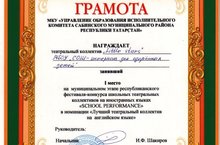 По итогам муниципального тура республиканского фестиваля-конкурса школьных театральных коллективов на иностранных языках «School Performance» театральный коллектив нашей школы “Little stars” занял 1 место в номинации “Лучший театральный коллектив на английском языке”, также был награжден дипломом “За лучшую декорацию”. Поздравляем коллектив и руководителей. Желаем успехов и победы в зональном туре.
