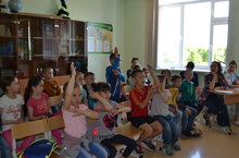 Несмотря на пасмурные дни, жизнь в лагере кипит. После бодрой зарядки и вкусного завтрака ребята занимались по секциям: угадывали мелодии и голоса персонажей из различных мультфильмов, занимались чистописанием, а на психологическом тренинге рисовали и рассказывали про несуществующее животное.