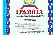 В целях развития чувства коллективизма, товарищества, уверенности в своих силах 15 ноября 2017 года в МБУ ДО «ЦДТ» состоялась интеллектуально-спортивная игра «Быстрее! Выше! Сильнее! - 2017». Организаторами игры были представители Детской районной Думы. Участниками МБОУ «СОШ-интернат для одаренных детей» стали ученики 7 класса: Хабибуллина Марьям, Валиева Камиля, Шайхутдинов Нур, Сабиров Мурат. Для команд были подготовлены разные задания: «Узнай пионерскую песню», «Танцы народов мира», «Столицы», «Спортивная остановка» и др. Учитывая баллы жюри, победителями этой игры стали ученики нашей школы! С чем мы гордимся и желаем дальнейших побед и творческого потенциала!