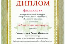 В номинации «Воспитать человека», район представила педагог-организатор школы для одаренных детей, победитель зонального этапа конкурса, Г.Н.Гиззатуллина. Она достойно прошла все конкурсные испытания и представила свой опыт работы с подрастающим поколением. Поздравляем Гулину Назимовну и желаем новых высот в достижении поставленных целей. -