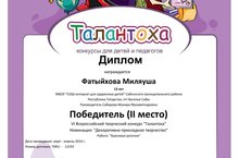 Ученица 7 класса МБОУ «СОШ – интернат для одаренных детей» Фатыйхова Миляуша участвовала в 6-м Всероссийском творческом конкурсе «Талантоха» в номинации «Декоративно-прикладное творчество». Работа Фатыйховой Миляуши была высоко оценена членами жюри и она стала победителем 6-м Всероссийском творческом конкурсе «Талантоха» в номинации «Декоративно-прикладное творчество» за работу «Красивые розочки» и заняла II призовое место, награждена дипломом конкурса для детей и педагогов «Талантоха» (руков.Сабирова Мунира Мухаметнуровна).