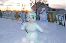 В предновогодние дни погода показывает свой характер: то плачет холодными слезами, то студит и холодит всю ночь. Наши снежные фигуры терпеливо сносят все её причуды, наши мастера неустанно подправляют и докрашивают вылепленных снежных героев. На школьном дворе дотемна не смолкают радостные голоса катающихся с горки детей.