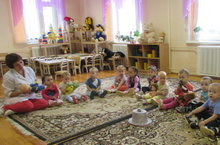 Бүген, икенче иң кечкенәләр төркеменең музыка шөгылендә Нурания Әюповна "Йокла курчак" темасына карата үзенчәлекле эшчәнлек үткәрде. Төркемгә кунакка курчаклар һәм куян да килгән иде. Балалар нәни курчакларны М.Мозафарованың "Йокла курчак" җырына җырлый-җырлый тирбәтергә өйрәнделәр.. Эшчәнлекнең максаты да нәкъ шуларга юнәлдерелде: балаларда күңелле көйгә карата шатлык хисе турыду, җыр эчтәлеге буенча хәрәкәтләр ясап,образга кереп, гади бию хәрәкәтләрен башкару.