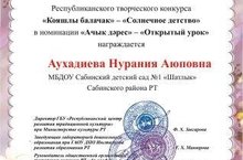 Республика бәйгесеннән бүләк 26.12.2016 Тәрбиячеләребез республика күләм бәйгеләрдә катнашуны дәвам итәләр һәм нәтиҗәләре дә уңышлы. Шушы көннәрдә Аухадиева Н.А. "Тылсымлы куллар" җурналы үткәргән "Кояшлы балачак" дип исемләнгән бәйгедә катнашып дипломга ия булды. Без коллегабызны чын күңелдән котлыйбыз!