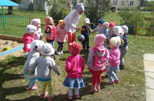 Икенче кечкенәләр төркеме балалары тәрбияче Гүзәл Хәмзевна белән берлектә "Минем яңгырвакылы, күңелле тубым" уены вактытында тупны сикертеп, тәгәрәтеп булуын күзәттеләр. Туп кебек үзләре дә сикерә һәм бер юнәлештә таралып йөгерә белүләрен күрсәттеләр.