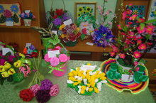 "Тормыш яме - чәчәкләр" 28.11.2014 Бу атнада бакчабыз гуя чәчәкләр иленә әйләнде. "Тормыш яме - чәчәкләр" исеме астында Әниләр кул эшләренә оештырылган күргәзмәдә һәр төркем әниләре теләп катнаштылар. Бисер, кагәзь, җеп, табигать материалларыннан төрле ысуллар белән ясалган берсеннән-берсе матур чәчәк бәйләмнәре, композицияләр, паннолар һәр кайсы үз урыннарын алды. Әниләрнең уңган, оста, алтын куллы булулары, матурлыкны күрә һәм башкаларга җиткерә белүләре һәркемне сокландырды.