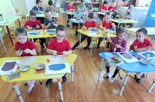Балаларда татар милли киемнәренә кызыксыну, аларның үзләренә генә хас булган нәфис бизәлешенә соклану хисләре тәрбияләү максатыннан мәктәпкә әзерлек төркемендә кисеп ябыштыру эшчәнлеге барышында балалар яфраклар, ләлә чәчәкләре белән читек бизәделәр.