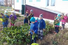 Балаларга хезмәт тәрбиясе бирү, тирә-юньдә танып белүчәнлекләрен үстерү максатыннан яшелчә бакчасында һәр төркемнең үз тәҗрибә участогы бар. Яз көне тәрбиячеләр белән берлектә балалар яшелчәләр утыртып, җәй көннәрендә су сибеп, төпләрен йомшарту, чуп утау эшләрен башкарсалар көзен уңыш җыялар. Бүген зурлар төркеме балалары тәрбияче Гилемханова Ә.Ә. белән чөгендер җыеп кышка саклауга куйдылар.