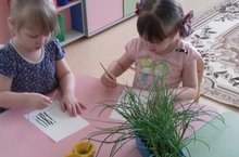Задачи: Вызвать у детей интерес к результатом своего труда по выращиванию зелёного лука,желание его нарисовать красками.Учить самостоятельно распологать изображение в определенной части лица бумаги ("в ящиках"),аккуратно пользоваться красками.