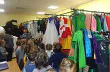 Сәхнә киемнәрен дә балалар бик ошаттылар. Кайбер битлекләрне хәтта тотып һәм киеп тә карадылар. ( Тәрбияче Шарипова Ф.М).