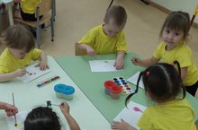 Бүген икенче кечкенәләр төркеме балалары рәсем шөгелендә түгәрәк формадагы җисемнәр күзаллап ясарга өйрәнделәр.Пумала белән пөхтә эшләүне ныгытып,балаларга үз эшләренә сөенү хисе уятырга булышлык иттем. (Сайфутдинова Г.З.)