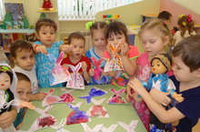Зурлар төркемендә балалар кисеп ябыштыру эшчәнлегендә салфетка ясау максатыннан симметрияле формада предметлар кисәргә өйрәнделәр ,икегә бөкләнгән кәгазьгә өчпочмак формасын ясап ромбик кистеләр, сурәтләрне кәгазь битендә дөрес итеп урнаштырдылар,эш барышында балаларның кайчы белән дөрес эшләү күнекмәләрен камилләштерелде, эшләренә анализ ясалды. (Тәрбияче: Солтанова Г.Г)