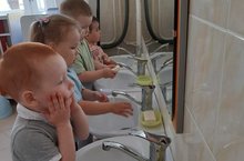 С целью формирования у воспитанников второй группы раннего возраста базовых культурно-гигиенических навыков после прогулки (а также при необходимости) приучаем самостоятельно мыть руки: брать мыло из мыльницы, намыливать руки, правильно и тщательно смывать грязь, знать местонахождение своего полотенца.