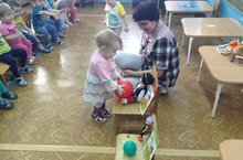 Цель игры: Учить детей различать форму шара, круга и размера «большой» и «маленький», вывести названия «большой» и «маленький».Дети получают шары 2- х размеров. Воспитатель показывает, как пользоваться игрушкой приговаривая:вот большой шар (дает детям подержать его), это маленький шарик (дает детям подержать). Вот они покатились. К большой кукле большой шар, к маленькой кукле маленький шарик.
