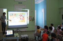 ФГОС дошкольного образования и УМК по русскому языку предусматривают использование при работе с детьми мультимедийной техники. С помощью этого оборудования мы показываем детям развивающие игры, мультфильмы, видеофрагменты, анимации. Также слушаем, сказки, песни, звуки, русские народные мелодии.