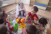 Сегодня к детям первой младшей группы пришли в гости бабушка и дедушка. Дети угостили их чаем, бубликами, фруктами.Во время сюжетно-ролевой игры дети научились играть дружно,уступать друг-другу, договариваться. Воспитывалось любовь и уважение к старшему поколению.