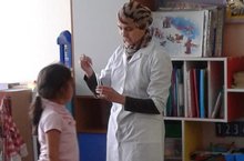 Бүген ясле төркеме шәфкать туташы Наилә апалары янына кунакка килделәр. Ул балаларны үзенең һөнәре һәм бүлмәдәге балаларның сәламәтлекләрен тикшереп торуче әсбаплар белән таныштырды. Балалар кызыксынып тыңладылар. Аларга кунакка бару бик ошады.