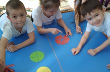 Буген зурлар төркеме балалары янына кунакка Акбай килде. Ул балаларга узе белән геометрик фигуралар алып килгән.Балалар тәрбияче апалары (Хамидуллина Р.Р.) белэн түгәрәкләрне 4 тигез өлешкә бүләргә , түгәрәкнен өлешләрен әйтергә һәм бөтен белэн өлешне чагыштырырга өйрәнделәр. Өчпочмак һәм дүртпочмак турында күзаллауларын киңәйттелэр.Бүгенге эшчәнлек барышы балаларга бик ошады.