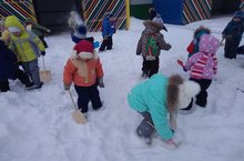 Икенче кечкенәләр төркеме балалары(тәрбиячеләре Хазиева А.Х б\н) саф һавага чыккач, бик теләп бәләкәй көрәкләр б/н кар көриләр. Алар шулай Раиль абыйларына булышуларына бик сөенәләр