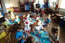 Бүген икенче кечкенәләр төркеменә (тәрбиячеләре Хазиева А,Х) ябыштыру шөгыленә, үзенә иптәшләр эзләп Кар бабай килде. Балалар тырышып аңа иптәшләр ябыштырдылар. Күзләрен, борынын, кулларын фломастерлар б/н ясадылар. Кар бабай мактагач, балаларның бик күңелләре булды.