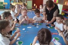 Бүген 1 төркем балалары тәрбиячеләре Хазиева А.Х. белән уч төпләрен буяуга манып, кош рәсемен ясадылар. Тәпиләрен, томшыгын һәм күзләрен фломастер белән ясап тулыландылар. Балаларга бу төр рәсем ясау бигрәк тә ошады.