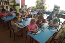 “Әкиятләр илендә” атна темасы уңаеннан, зурлар төркеме балалары бүген А.С.Пушкиннын “Алтын балык” әкиятенең, балыгын әзер формалардан кисеп ябыштырдылар. Бу төр кисеп ябыштыру балаларга бик ошады, аларның куңелләре бик шат булды. Кисеп ябыштыру балаларның уйлау фикерләү сәләтен үстерә, кул-бармаклар мускулын ныгыта, бер-берсе белән аралашу, дуслык мөнәсәбәтен көйли, сүзлек байлыгын арттыра.