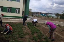 Мәктәп яны бакчасында эш дәвам итә. Бүген укучылар түтәлләр ясап, суган утырттылар.