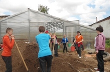 Иртәнге аштан соң, балалар гимназиябезнең тәҗрибә җитештерү участогында эшләделәр. Төзелеп килүче зур, заманча теплицага черемә керттеләр. -